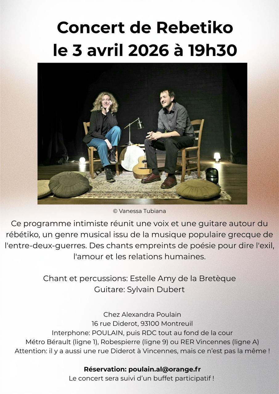 Ce programme intimiste réunit une voix et une guitare autour du rébétiko, un genre musical issu de la musique populaire grecque de l'entre-deux-guerres.Des chants empreints de poésie pour dire l'exil, l'amour et les relations humaines.